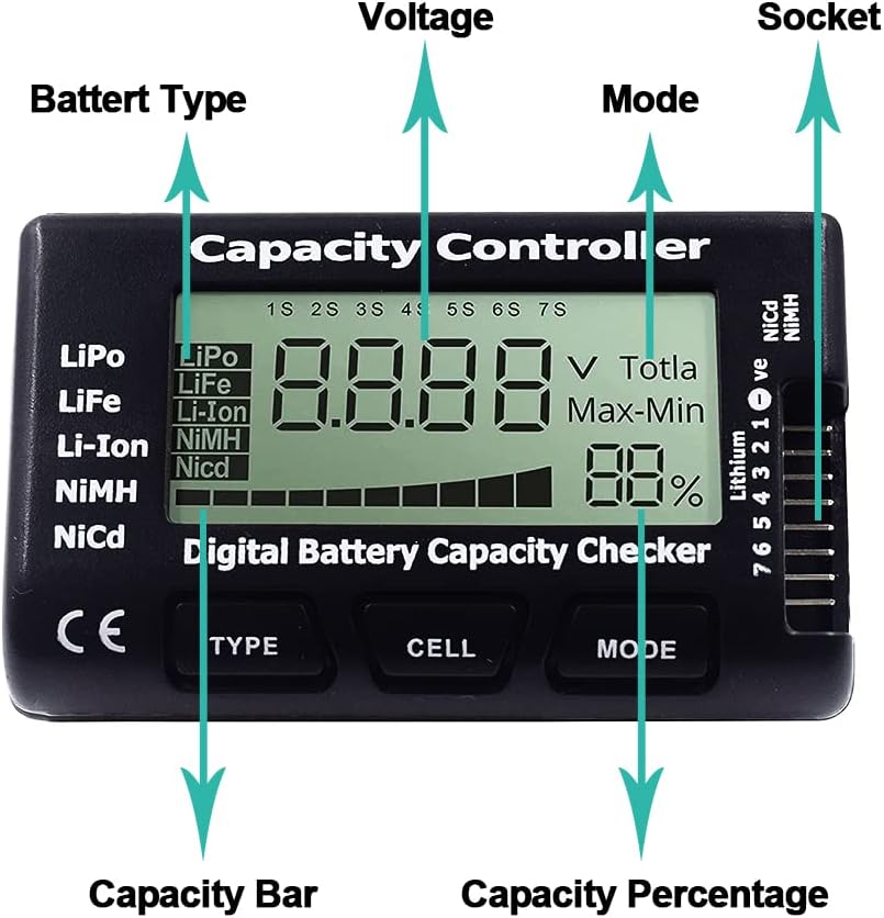 Connect the Battery Balance cable to the Battery Voltage indicator to check the battery voltage. Ensure the red wire is closest to the bottom of the voltage indicator when plugging the balance cable.