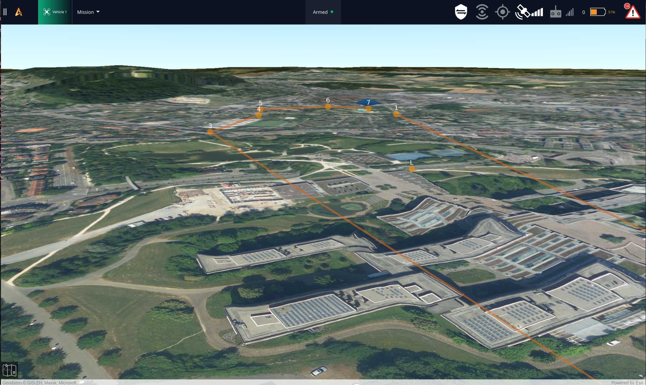 The 3D view enhances the planning and execution of a mission by giving a sense of the elevation and the detailed form of the ground below the flying vehicle. It can provide valuable information to the user that can lead to more accurate altitude planning based on actual requirements. To Access the 3D view, a button on top of the small video screen should be used: