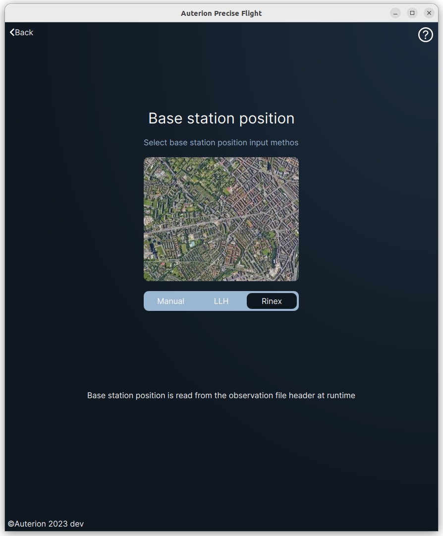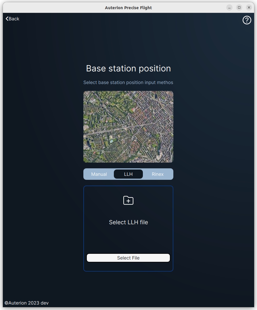 In this mode, you can select a LLH file logged by the base station (E.g Emlid RS2) in order to set the base station position. Precise Flight will average the position and show the result on the map.