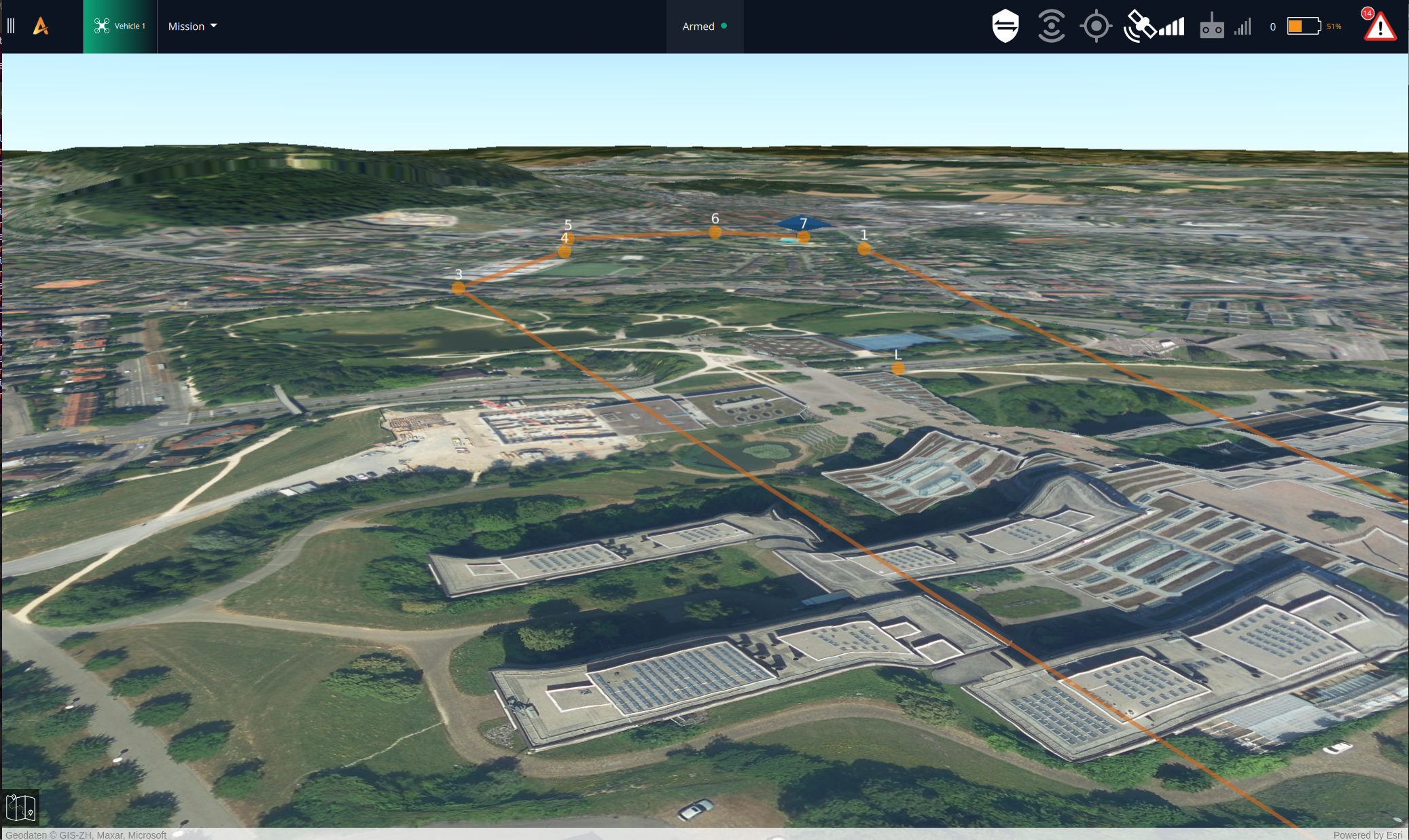 The 3D View is based on the [ArcGIS](https://www.esri.com/en-us/arcgis/products/arcgis-online/overview) from [ESRI ](https://www.esri.com/en-us/home)and provides a great tool for a 3D visualization of the planned mission during planning and flying.