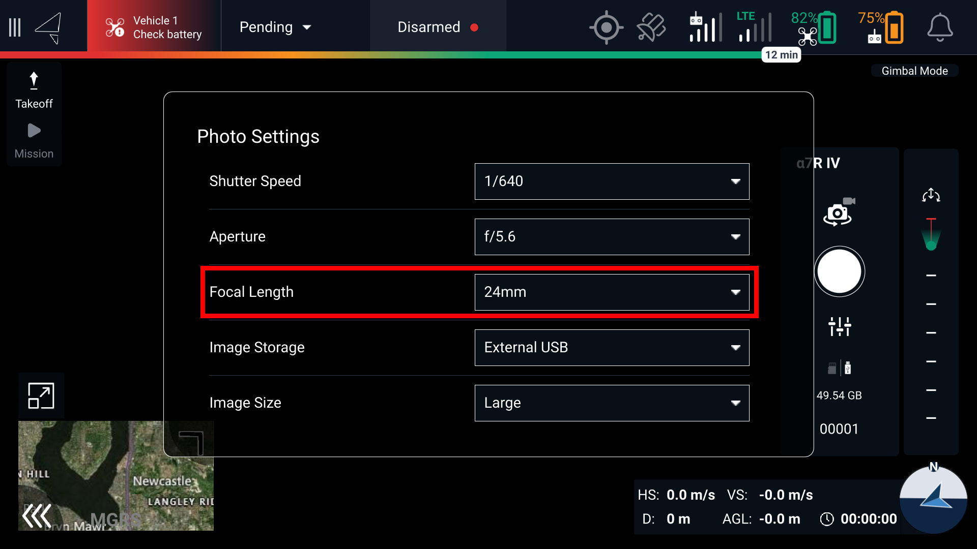2\. Open the camera view for the payload, and select the settings icon. Select the lens that matches what you're using (default 24mm).