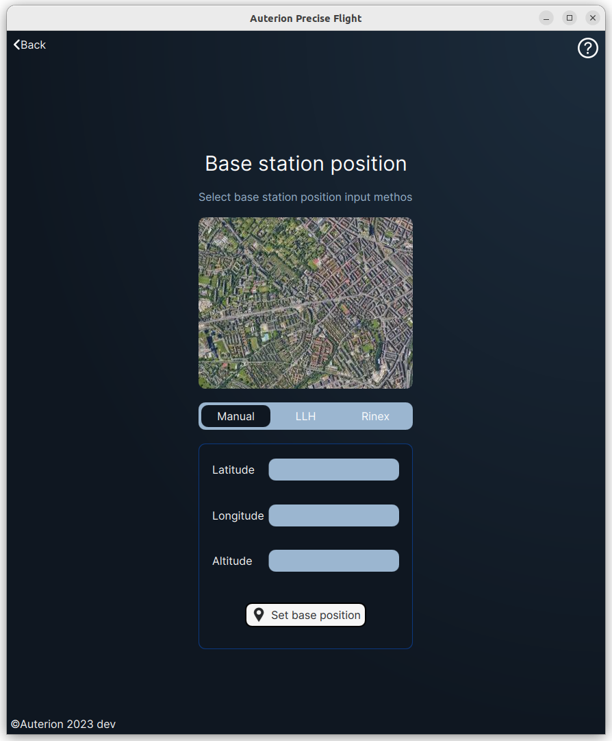 In this mode, you can select a LLH file logged by the base station (E.g Emlid RS2) in order to set the base station position. Precise Flight will average the position and show the result on the map.