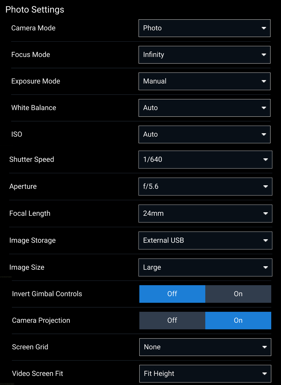 AMC provides control of these settings in flight by pressing the ![](https://721100047-files.gitbook.io/~/files/v0/b/gitbook-x-prod.appspot.com/o/spaces%2FPGMrULovSCSAisV8bLg3%2Fuploads%2FEhKiuTh48D494Eb6naGW%2Fimage.png?alt=media\&token=195e4581-be36-4ef1-bc70-64a06b4279c7) icon on the right of the screen while in Photo Mode: